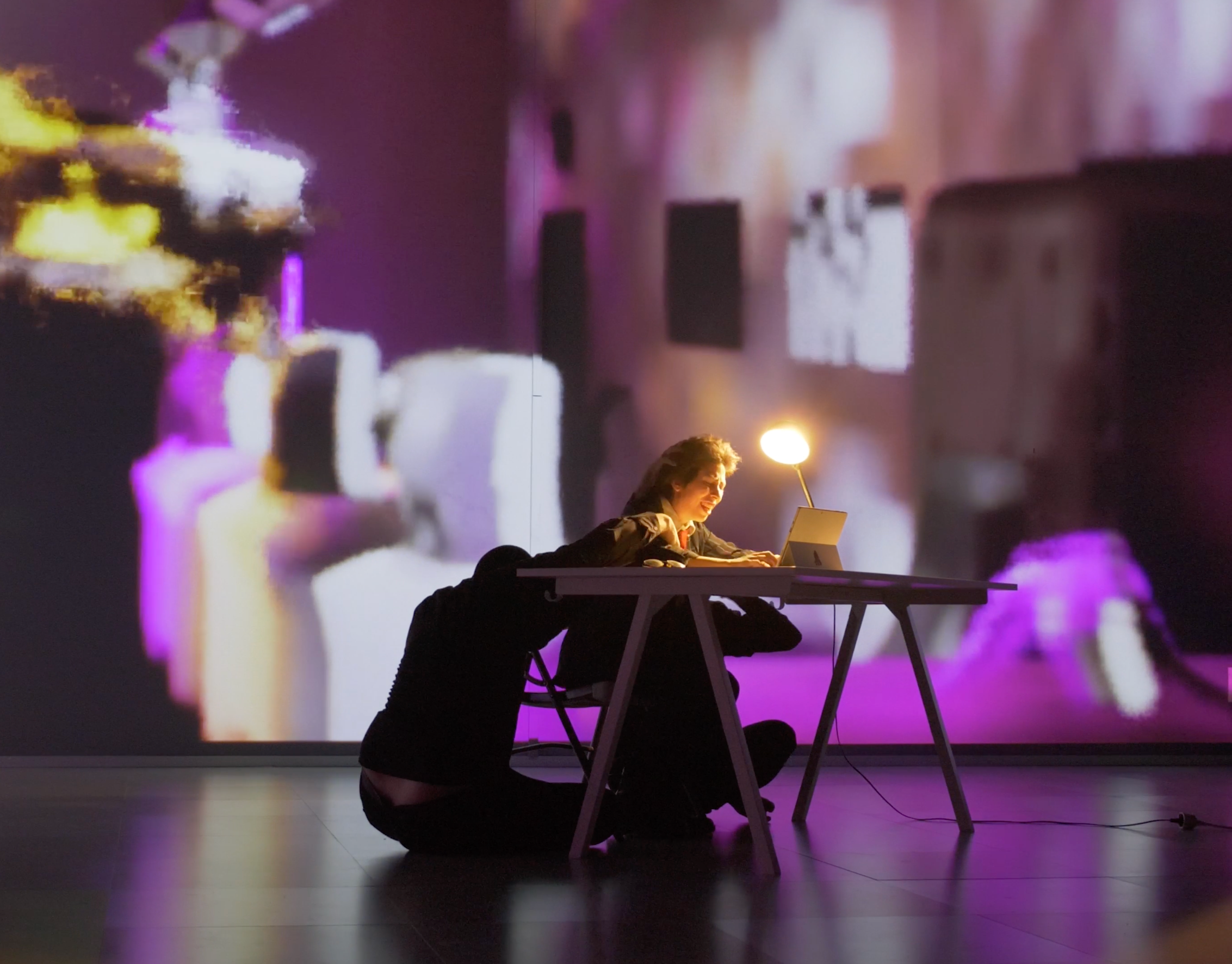 Digital scenography turning the stressful workspace into a dreamlike world to immerse audiences between reality and escapism.